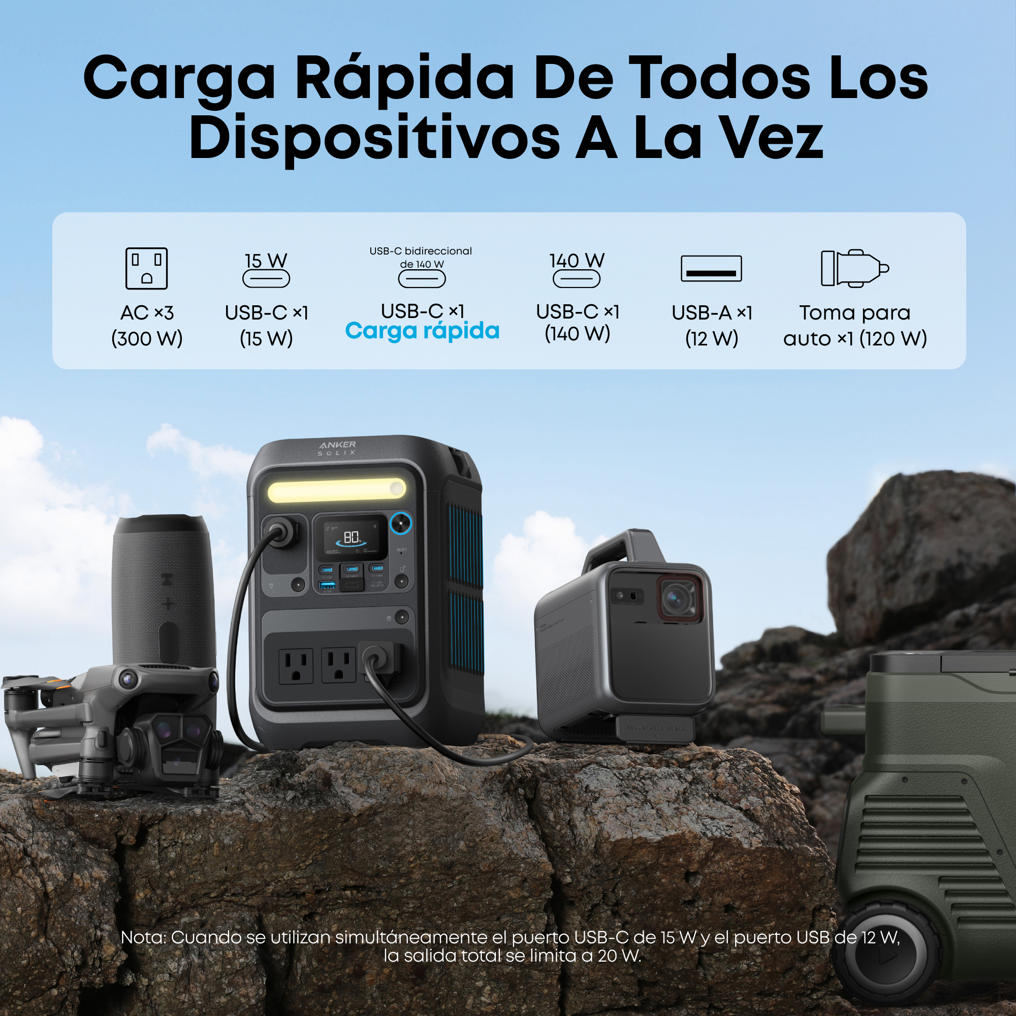 Anker SOLIX C300 (288Wh, 300W): Estación de energía portátil de 288Wh con salida continua de 300W (600W pico) y carga rápida USB-C bidireccional de 140W. Su diseño es un 15% más compacto que estaciones similares y admite carga solar (paneles Anker de 100W/60W recomendados). Se recarga al 80% en solo 50 minutos, funciona ultrasilenciosa (25 dB) y ofrece respaldo inmediato (10 ms). Además cuenta con control inteligente vía app (Bluetooth/Wi-Fi) y baterías LFP de larga duración (5 años de garantía).