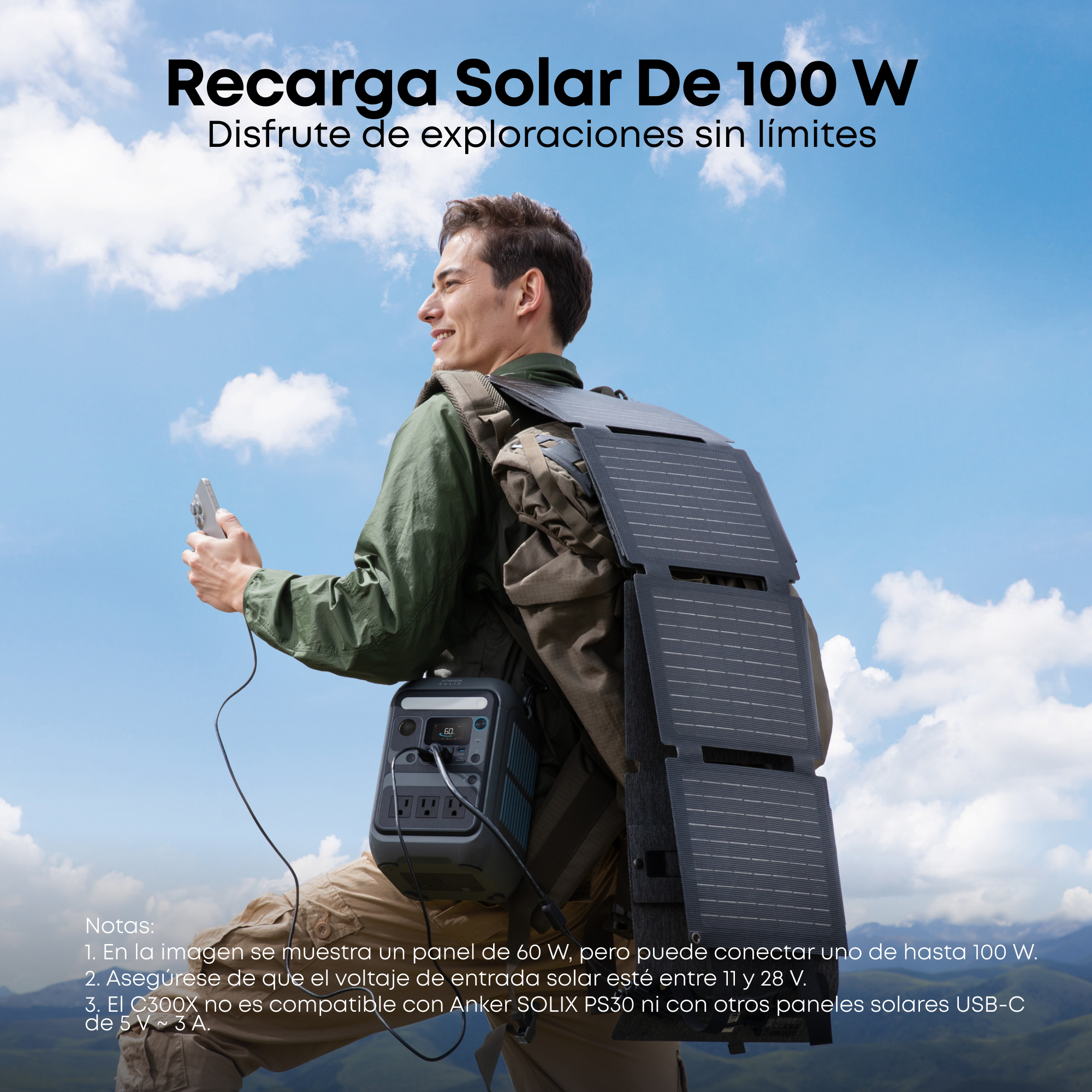 Cuando tu viaje necesite carga ilimitada, hazlo sin interrupciones y de manera sostenible con un panel solar de 100W. Recomendamos panel solar Anker de 100W o 60W. Esta estación de energía no es compatible con Anker SOLIX PS30 (u otros paneles USB-C 5V~3A), PS200, PS400.